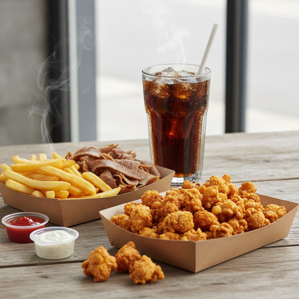 Portion Of Popcorn Chicken, Chips, Donner Meat And Drinks